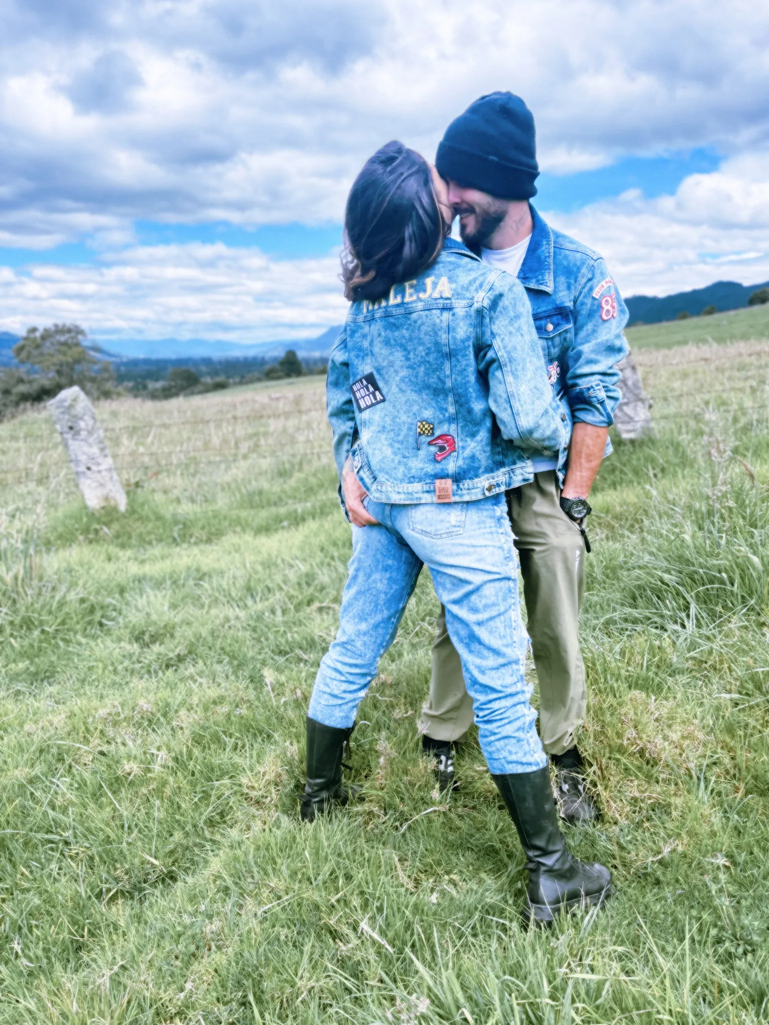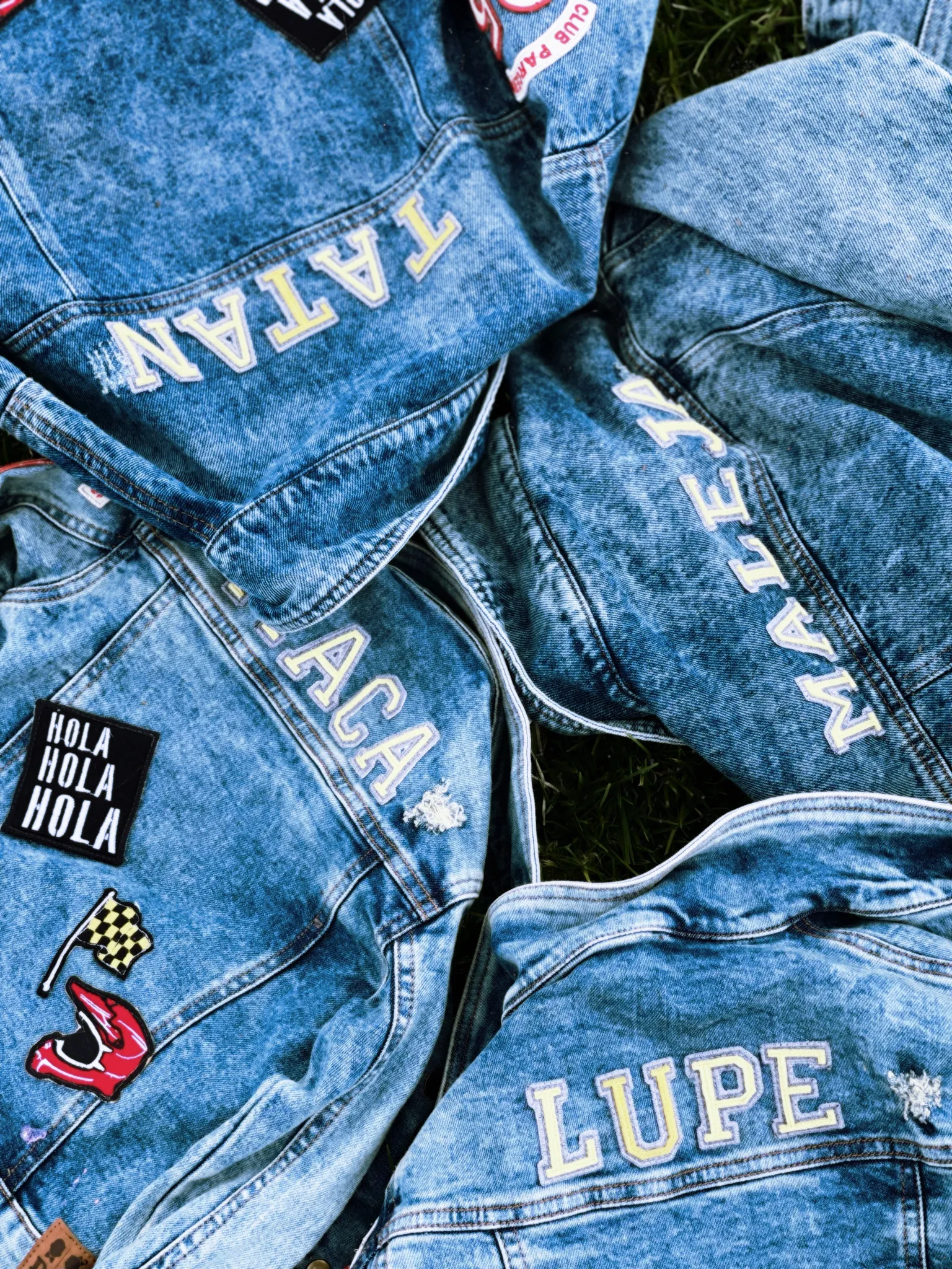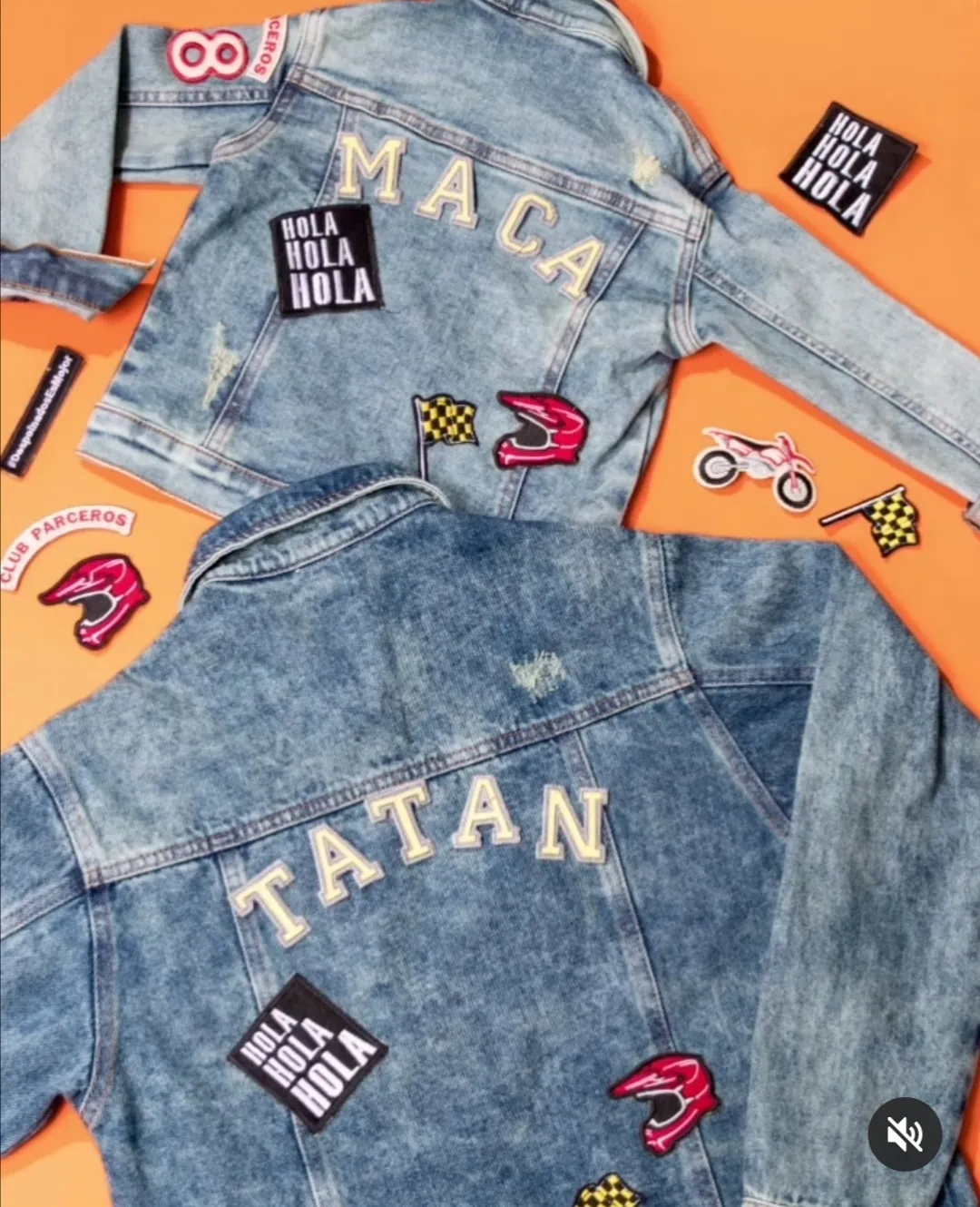 puedes personalizarla con tu nombre (maximo 6 letras), la chaqueta en la espalda viene con los apliques de HOLA HOLA, CASCO Y BANDERITA.
